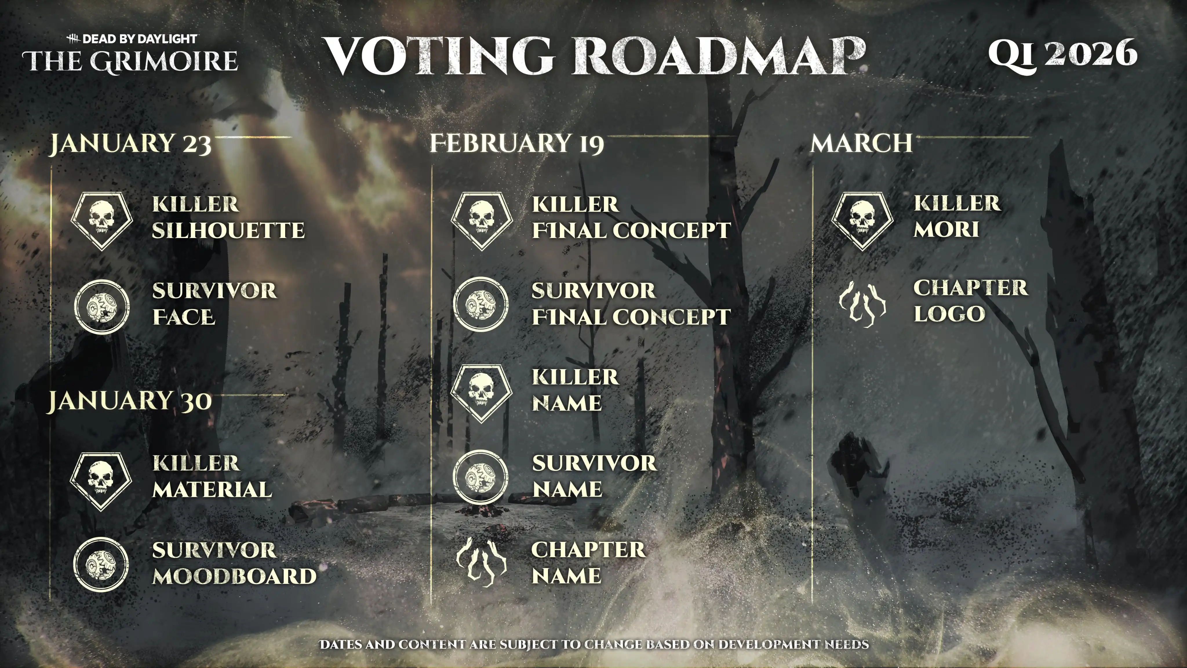 Na službenoj stranici igrače dočekuje The Grimoire, interaktivna knjiga kroz koju se glasovanjem odlučuje o budućnosti igre. Proces započinje izborom jednog od četiri ponuđena survivora, nakon čega slijedi glasanje za killera – tri tajanstvene siluete koji tek nagovještavaju kakvo nas čudovište očekuje. Iako se iz silueta teško može zaključiti konačni izgled, svi kandidati djeluju dovoljno prijeteće da bi se savršeno uklopili u mračnu atmosferu Dead by Daylighta.
