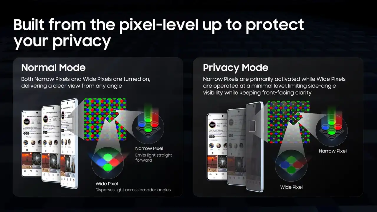 Privacy Display zaslon na Galaxy S26 Ultra uređaju nova je vrsta osobne zaštite ugrađena izravno u uređaj koja vam omogućuje prilagodbu vidljivosti sadržaja na zaslonu. Kada je uključen, prikaz je jasan za korisnika, dok ograničava ono što drugi mogu vidjeti kada zaslon gledaju sa strane, idealno kada putujete ili se nalazite na drugim javnim mjestima.